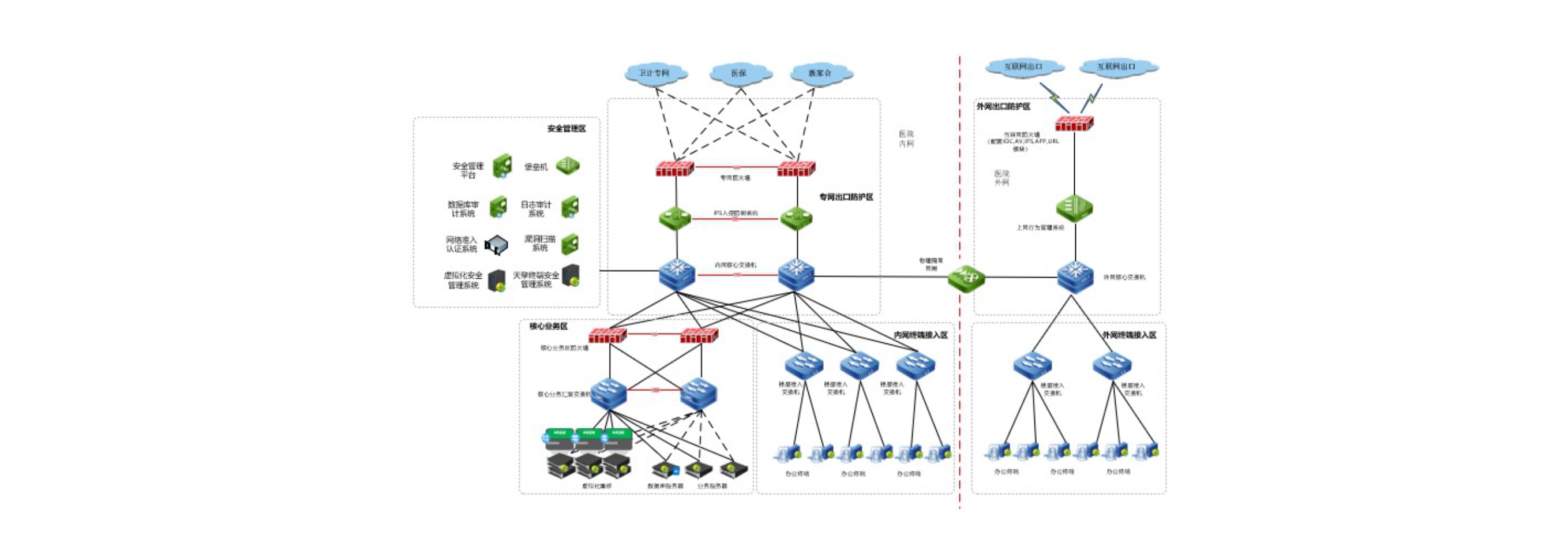 隨著醫(yī)療衛(wèi)生行業(yè)信息化的快速發(fā)展,信息系統(tǒng)所面臨的安全威脅日益復(fù)雜,且最近兩年醫(yī)療系統(tǒng)爆發(fā)大面積勒索者病毒,造成業(yè)務(wù)中斷,對醫(yī)療服務(wù)造成嚴(yán)重影響,各醫(yī)療系統(tǒng)用戶對信息安全系統(tǒng)的需求與日俱增,原有的安全防護(hù)措施已不足以應(yīng)對現(xiàn)在的安全威脅。并且根據(jù)國家《衛(wèi)生部辦公廳關(guān)于全面開展衛(wèi)生行業(yè)信息安全等級保護(hù)工作的通知》,在“十二五”期間對包括三甲醫(yī)院在內(nèi)的所有衛(wèi)生行業(yè)全面開展等級保護(hù)建設(shè)工作,**醫(yī)院為保證為落實國家等級保護(hù)制度的相關(guān)要求,進(jìn)一步提升單位信息安全防護(hù)能力,開展了等級保護(hù)安全保障體系建設(shè)工作,并提升本單位信息系統(tǒng)的整體安全防護(hù)水平。