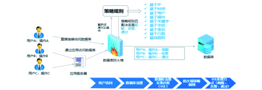 系統(tǒng)區(qū)別于傳統(tǒng)的網(wǎng)絡(luò)防火墻,具有網(wǎng)絡(luò)和應(yīng)用行為的多個(gè)層次的全方位防護(hù)體系。不僅能夠在TCP/IP協(xié)議棧的2-4層上對(duì)源和目的的IP、端口號(hào)、MAC等進(jìn)行訪問控制,更能夠?qū)崟r(shí)監(jiān)控?cái)?shù)據(jù)庫操作行為,對(duì)SQL注入攻擊和異常訪問等進(jìn)行風(fēng)險(xiǎn)鑒別和非法阻斷。